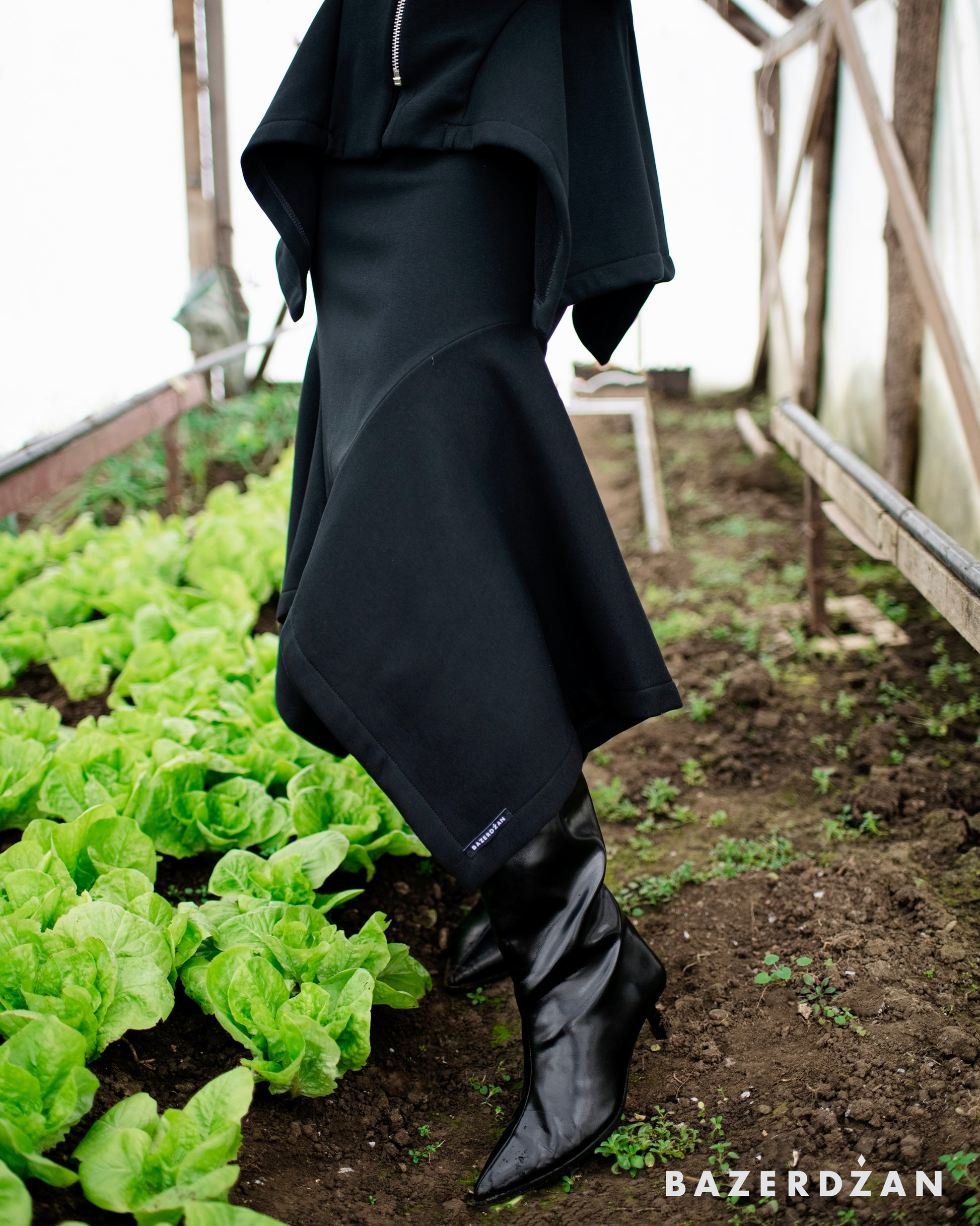 This elegant midi skirt is designed with a fluid, sculptural silhouette that moves beautifully with the body. The asymmetric hemline adds a modern, artistic touch, creating visual interest and dynamic movement.